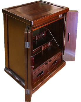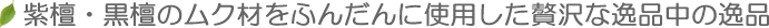 最高級木材である紫檀(または黒檀)のムク材をふんだんに使用した大変贅沢なお仏壇です。通常ムク材と称したお仏壇でも見えない部分などは他の木材や合板などを使用していますが、このお仏壇の場合、四方・上下・内部のほとんどの部分で紫檀材(または黒檀材)のムク材を使用しています。