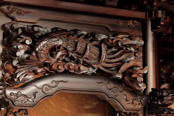 一見しただけで分かるほど手の込んだ彫刻は見れば見るほど美しく荘厳ですが、それでいて華美すぎるということなく、むしろ涼やかな印象さえ見受けられます。 これは目立ちすぎない華やかさを愛する江戸独特の文化を継承する職人の心意気といえます。 |