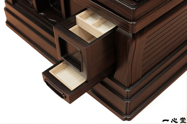 角には、加工に手間と高度な技術が求められる「モッコ面」と言われる面の取り方をしています。一番下には大引きと呼ばれる引き出しを設け、収納面でも優れています。彫刻などの装飾だけでなく、お使いになる方のことを考慮した大変優れたお仏壇となっております。