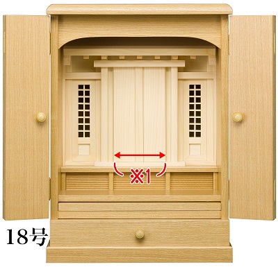 従来のものでは安置する場所がないとお考えの方に大変人気があります。 ウレタン塗装仕上げとは、材の美しさを活かしつつ、コーティングを施す塗装方法で、多少水分を含んだ布巾で拭いてもシミになりにくく、掃除・維持がしやすい大変便利な塗装です。 ※1・・・中央の扉の幅は14cmです。霊璽(れいじ)を安置する際の参考にして下さい。 |